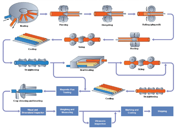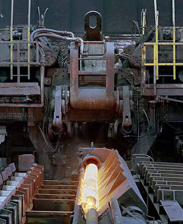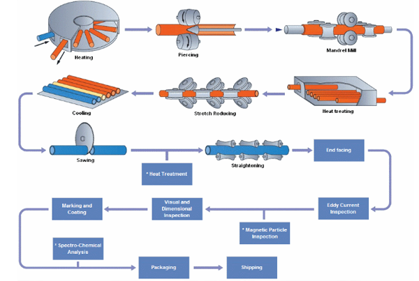 In the Mandrel Mill Process, a solid round (billet) is used. It is heated in a rotary hearth heating furnace and then pierced by a piercer. The pierced billet or hollow shell is rolled by a mandrel mill to reduce the outside diameter and wall thickness which forms a multiple length mother tube. The mother tube is reheated and further reduced to specified dimensions by the stretch reducer. The tube is then cooled, cut, straightened and subjected to finishing and inspection processes befor shipment.